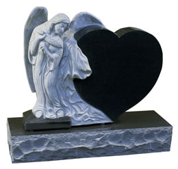 A beautiful hand carved angel leaning on a heart. This beautiful Monument is 40”wide x 8” thick x 33” high. The heart is polished on the front, back and sides. The base is 48” wide x 14”deep x 8” thick. Shown here in Black and available in many colors. The listed price is in grey.