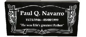 The Flat Marker is the most economical type one will find. Flat Markers lay flat on the ground and come in a number of sizes and colors. Our prices start at $225, shipping included. The lower price tag does not mean lower quality. These Markers will beautifully mark the resting place of a loved one for centuries to come.